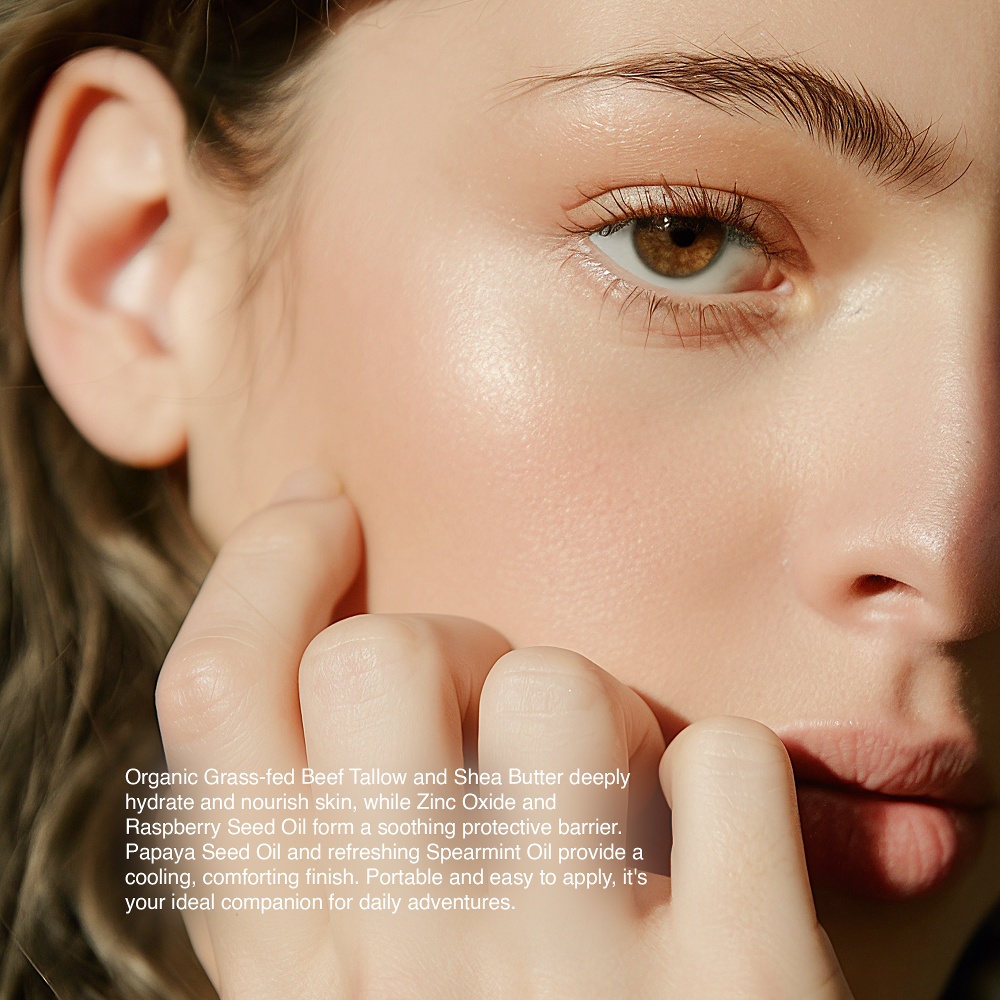 A nourishing balm stick designed to comfort and hydrate skin before and after sun exposure. Crafted with organic grass‑fed beef tallow, antioxidant‑rich raspberry seed oil, non‑nano zinc oxide for a calming barrier, soothing papaya seed oil, and refreshing spearmint oil, this stick moisturizes and comforts your skin. Ideal for all skin types, it’s easy to apply and free of synthetic additives.
